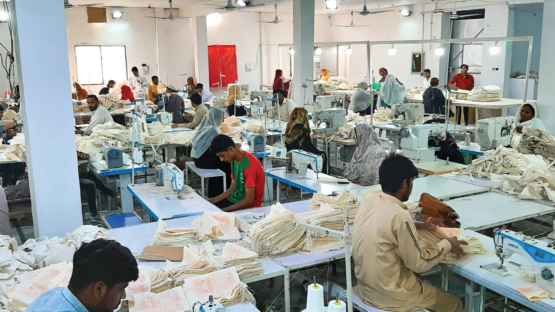 - Fabric rolls are spread on cutting tables.